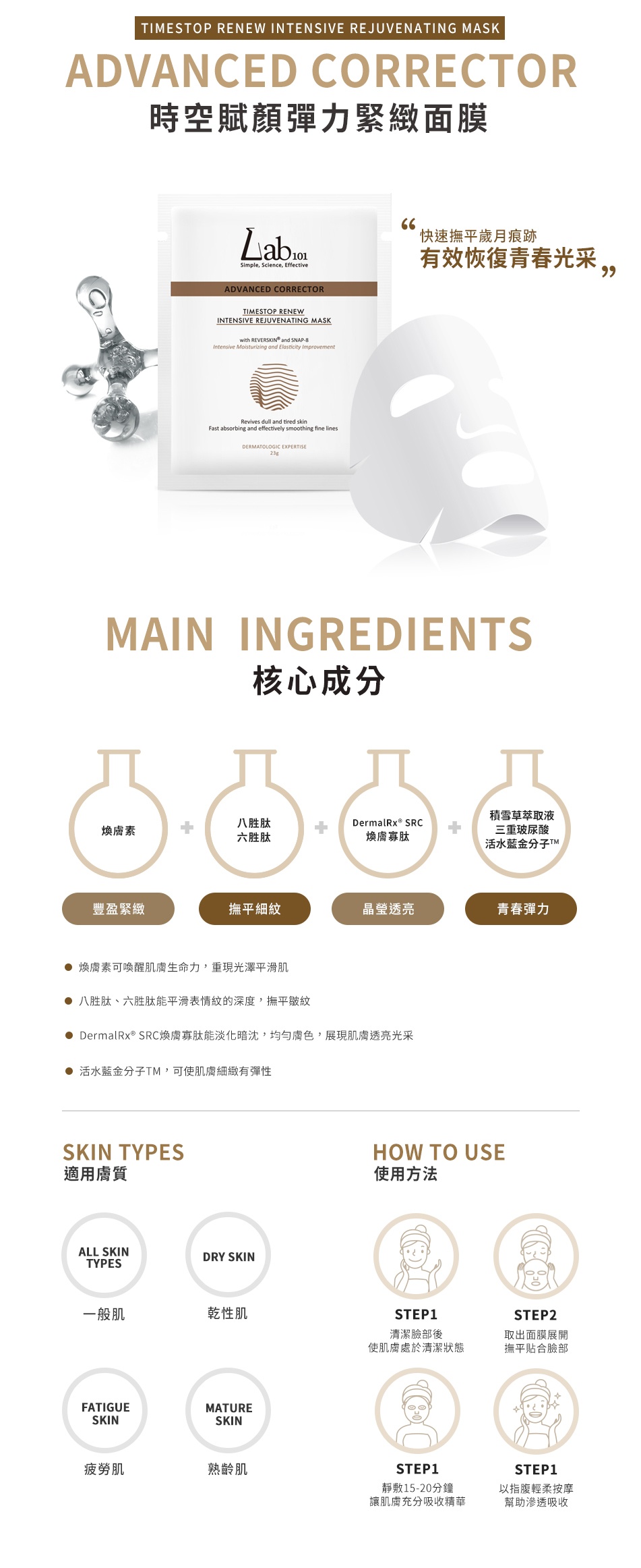 - 以高親膚性、高透氣性的天絲面膜為載體,利用其高滲透傳導的功能,搭配玻尿酸甦活因子、Phytosterol賦活肌膚,及撫平動態紋的Octapeptide八胜肽,深層導入,恢復肌膚水嫩彈力,快速撫紋、緊實、緊緻,使肌膚年輕豐盈及澎潤